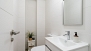 There is a toilet and a laundry room with a washing machine, next to the kitchen.
