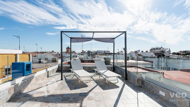 Spacious 1-bedroom apartment with a private terrace and a solarium. It is centrally located at calle Alfaqueque, near the Fine's Art Museum and 5 minutes walk from the main shopping streets: Sierpes, Tetuán and Cuna. The Cathedral is just about 15 minutes away. Suitable for up to 3 guests.