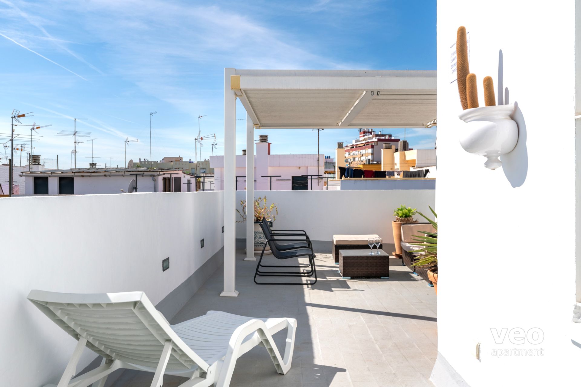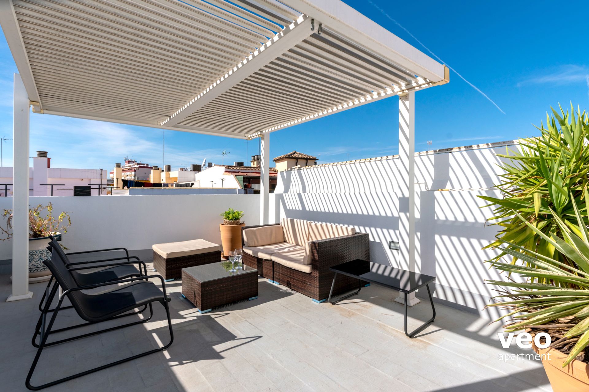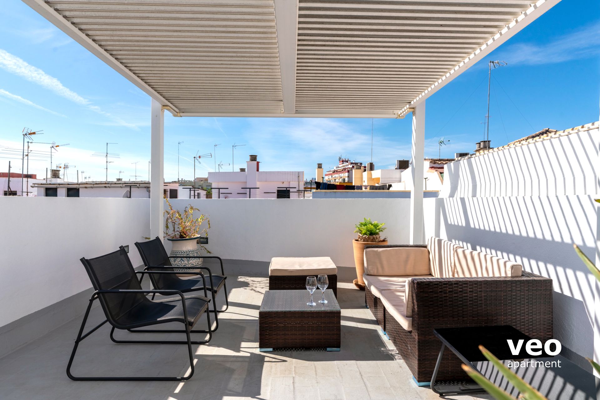 Ático con 2-dormitorios y una gran terraza privada. Situado en el corazón de Triana, en la calle Alfarería, cerca del río y a 15 minutos a pie del centro histórico, pero fuera de las zonas de bares y ruidos.
