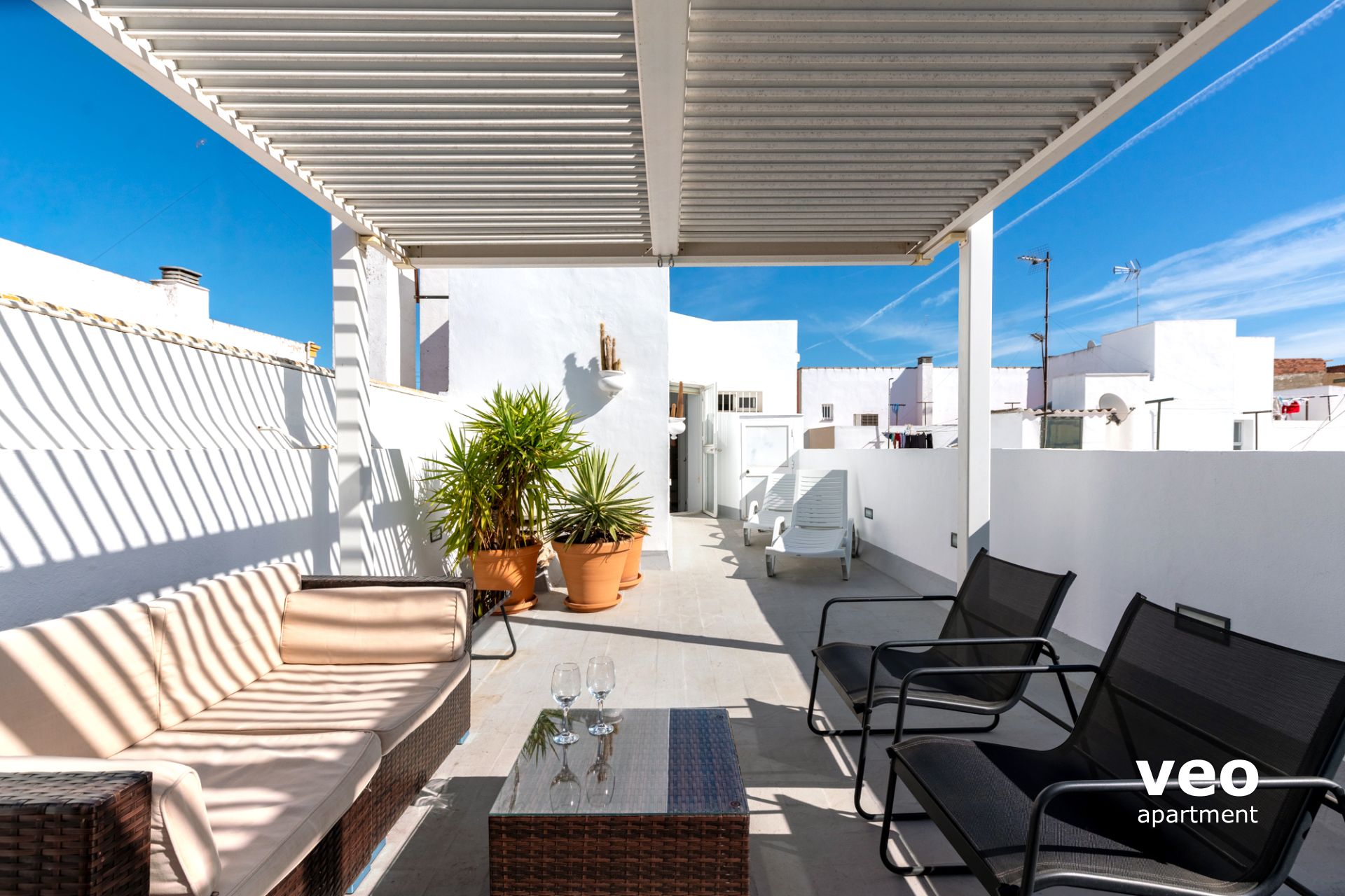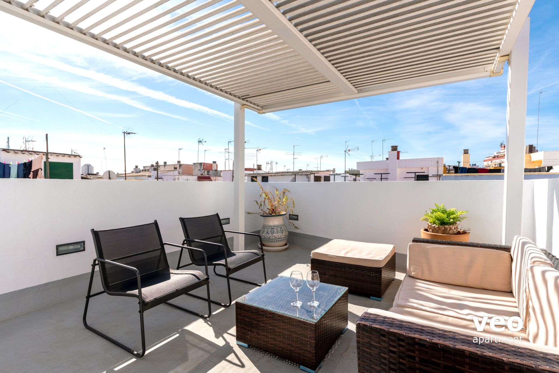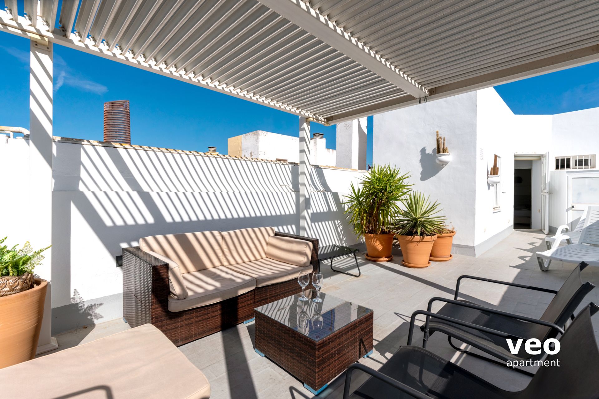 Ático con 2-dormitorios y una gran terraza privada. Situado en el corazón de Triana, en la calle Alfarería, cerca del río y a 15 minutos a pie del centro histórico, pero fuera de las zonas de bares y ruidos.