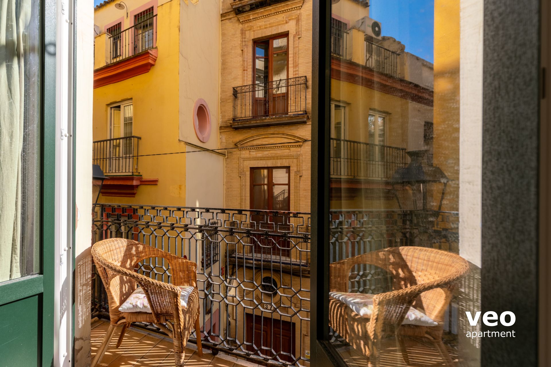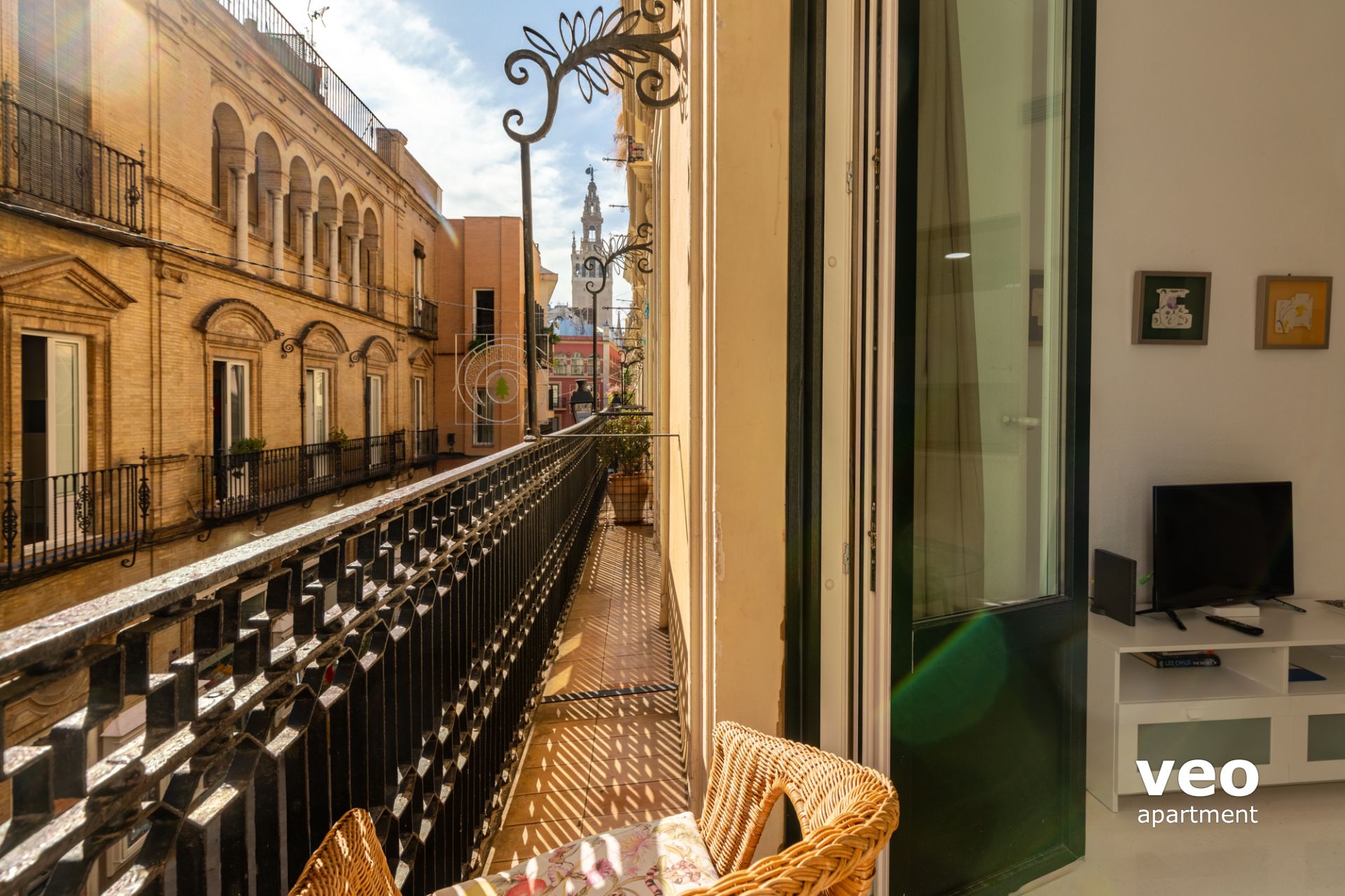 There is a living area with a sofa and a dining table with chairs. French windows give on to a balcony which looks out over the street, including views of La Giralda to the right.